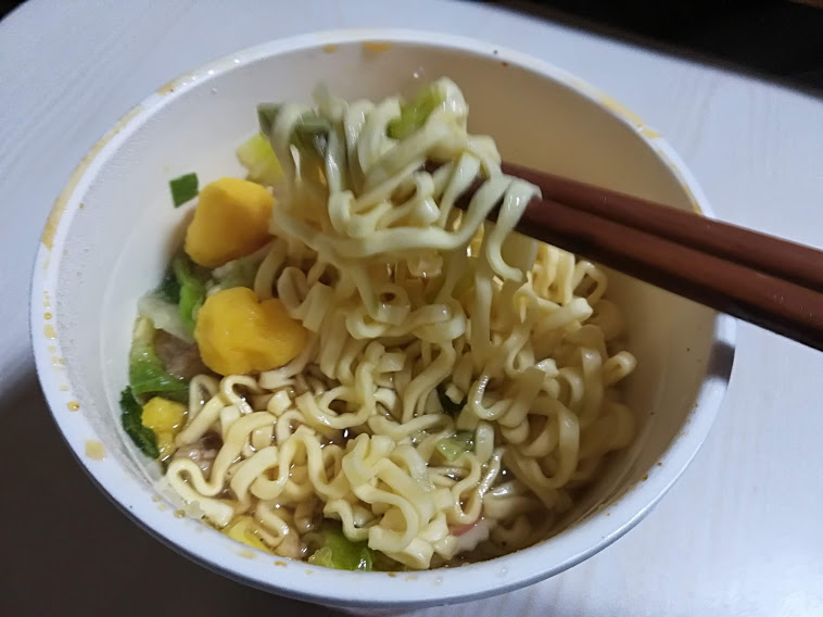 標準的な醤油味のカップ麺という感じで、それが最大公約数的なポピュラリティを獲得しているのだと思います。